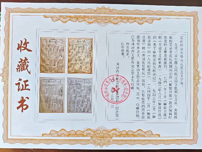 在这个特殊的日子里,西南林业大学马克思主义学院以捐赠《解放日报》的方式,向抗战先辈们致以最崇高的敬意。同时以此为契机,进一步加强与艾思奇纪念馆等红色文化机构的合作,共同开展红色文化的大思政课建设,为推动红色文化的繁荣发展做出贡献。