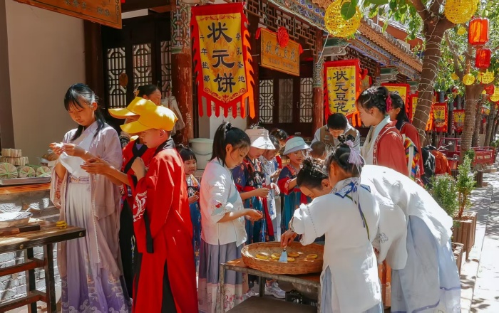 清晨的阳光洒在红沙石板街上,远处传来的《论语》诵读声打破了古镇的宁静,一群身着汉服的学生正走过状元桥,走向那座经历了600多年风雨的孔庙。
