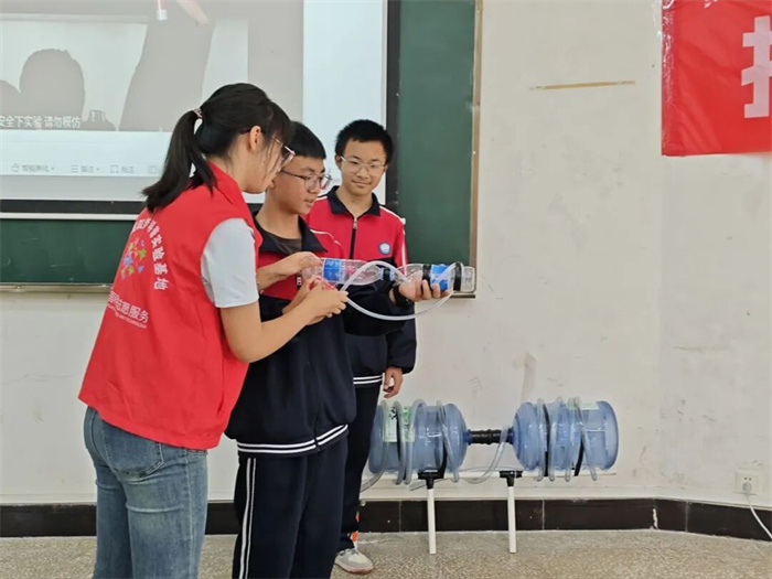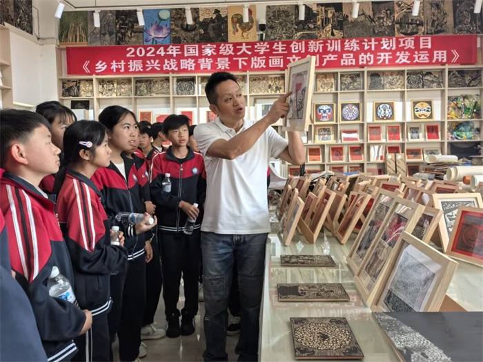 在图书馆,教师曹霖为学生们介绍了AI智能服务终端与馆藏资源,让同学们亲身感受现代化图书馆的智能便捷与学术氛围;在传习馆,师生共同参观了国家级大学生创新训练计划项目的版画文创作品展。美术与设计学院教师吴新林为大家讲解了民间木刻版画的艺术特色与制作工艺,从构图技法到文化寓意,使大家在直观感受传统艺术魅力的同时,进一步领悟其中所蕴含的民间智慧与美学精神。随后,美术与设计学院教师林远高为大家介绍了剪纸艺术的文化背景,细致讲解了剪纸技艺,并展示了多幅精美的剪纸作品;在筑梦科普基地,教师刘芳则组织了趣味实验和“空气炮制作”等实践活动,通过直观演示与动手操作,激发学生探索科学的兴趣。