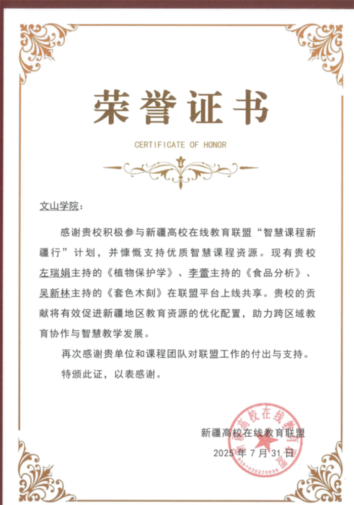 近日,“智慧课程新疆行”第一批上线课程名单公布,文山学院选送的《植物保护学》《食品分析》《套色木刻》课程通过审核,成功上线新疆高校在线教育联盟平台。作为云南省唯一入选高校,文山学院依托优质教育资源与智慧教学创新实践,为推进东西部高等教育协作与教育数字化战略注入了力量。
