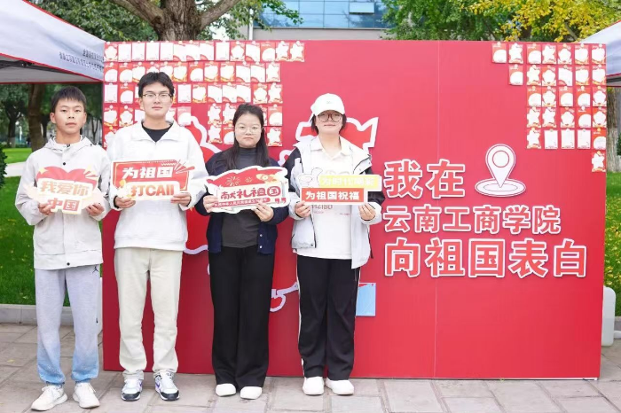 在“红色记忆转盘”环节,学生转动轮盘随机抽取演唱红色歌曲或讲述历史故事,在互动中回顾红色经典、感受革命精神。中国结编织体验区,志愿者向参与活动的学生传授中国结编织技巧,一根根红绳在指尖穿梭,交织成对祖国的深情祝福。学生在动手实践中真切感受到中华传统文化的魅力与温度。现场,一张巨幅中国地图逐渐被五彩的祝福便笺纸点缀。“愿祖国繁荣昌盛”“青春奋进正当时”等真挚留言,汇聚成生动的“祝福山河图”。一张张便签承载了青春的誓言,每一句祝福都蕴含着赤子之心。在“我在云南工商学院向祖国表白”打卡区前,同学们手持主题牌留下珍贵影像,并通过社交平台传递爱国情怀。