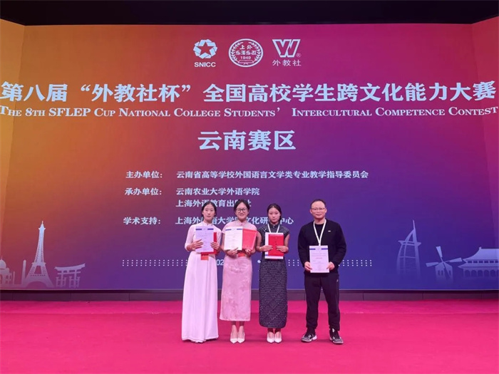 11月15日,第八届“外教社杯”全国高校学生跨文化能力大赛云南赛区决赛中,越南语专业团队(袁洁、刘春、柳海娇,指导教师陈家健)以“坚定文化自信,增进国际理解”为主题,凭借案例分析的专业视角、中国故事的生动诠释,荣获越南语组一等奖。